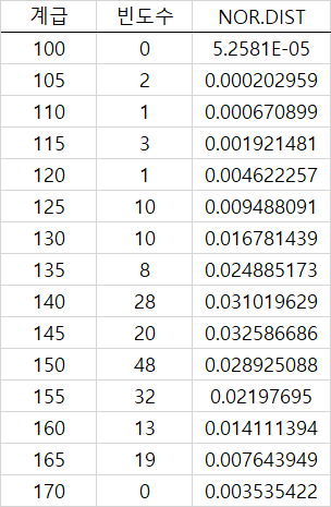 계급을 나누어 데이터의 빈도수를 체크 (히스토그램)한 뒤, 동일한 계급으로 NORM.DIST 함수로 정규분포의 확률 밀도 함수를 만든다.