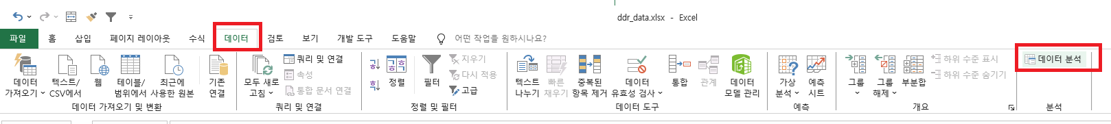 다시 엑셀을 열어보면 아래와 같이 '데이터' 메뉴에서 '데이터 분석' 버튼이 활성화 된다.