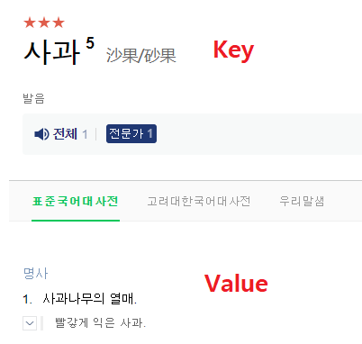딕셔너리는 말그대로 사전과 동일한 구조를 가지고 있다. Key는 사전의 단어를 나타내고 그 단어에 해당하는 설명을 Value에서 가지고 있다고 생각하면 이해가 쉬울듯 하다. 딕셔너리는 중괄호를 사용하며 각 요소는 ,(콤마)로 구분하고 Key와 Value는 :(콜론)으로 연결한다. Key는 고유한 값을 가지므로 수정은 불가하다.