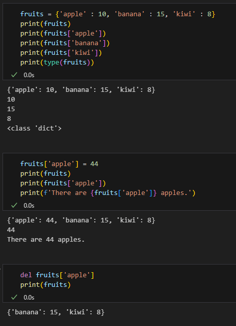 요소 추가/수정/삭제는 예제를 참조하면 될듯 하고.. 주의할것은 리스트와 딕셔너리는 Key 값이 될 수 없음을 기억하면 된다. (int, float, str, bool 등만 된다고 생각을..)