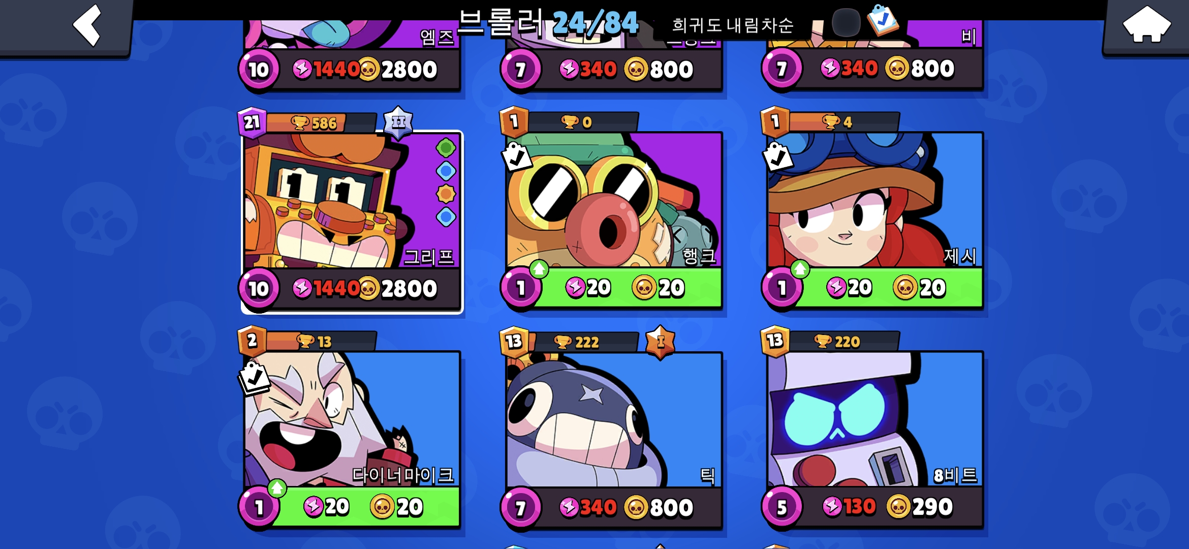 뭐..막대 그래프 같이 보이는건 이길수록 쌓여가는거라 이해는 쉬울듯 하고, 주의할건 계급이 올라갈수록 게임에 지면 트로피(왼쪽 상단)가 줄어든다. 가장 기본이되는 캐릭터는 브롤러(노란박스)에 들어가면 처음에는 기본 캐릭터가 보이고 게임에 이겨서 올라갈수록 다른 상위 캐릭터를 얻는 구조다. 나는 이미 여러번 게임을 진행했기 때문에 24 캐릭터가 있는것을 확인할 수 있다. 캐릭터 안의 동그라미가 레벨인데 이걸 위해서는 번개모양의 PP와 해골모양의 돈이 필요하다.