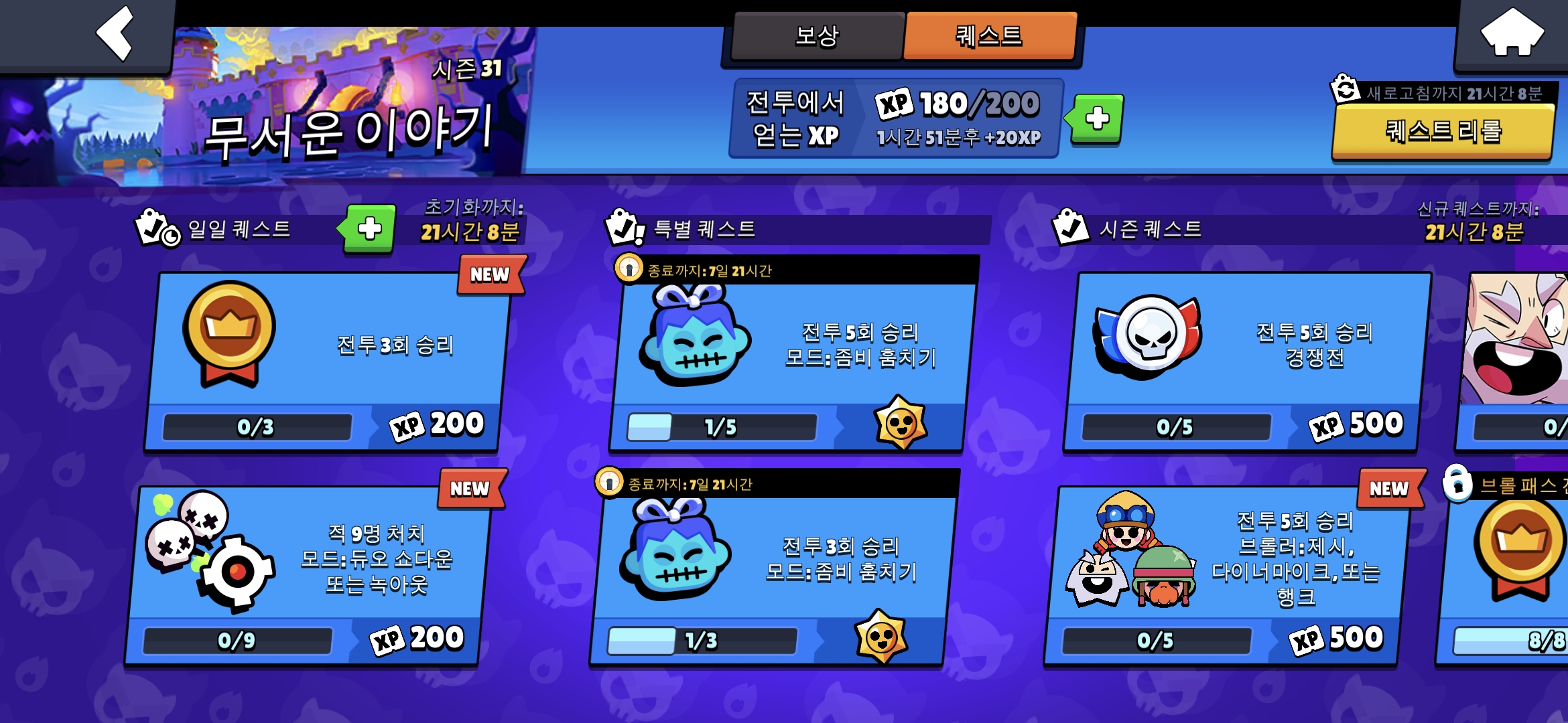 물론 승리를 계속할 수 있다면 더할 나위 없다. 게임을 위한 다양한 맵?/종류가 있기 때문에 마음에 드는것을 골라서 게임을 당장 시작하면 된다. 난 보통 퀘스트를 위해 게임종류와 브롤러를 선택한다. 아래영상은 듀오 쇼다운이란 게임을 하는 영상이다. 중간에 보면 퀘스트가 동시에 3개씩 수행되는걸 볼 수 있다. 여기서 게임을 위한 팁은 보석상자를 먹어서 파워를 올린다와 HP가 부족하는 숲에 들어가서 열심히 힐링을 한다는 2가지다. 마지막으로 게임이 끝나고 이어서 바로 시작하면 많은 대기를 하지않고 게임 시작이 가능하다. 여기까지가 여태 진행한 나의 경험을 바탕으로 써본다. 끝!