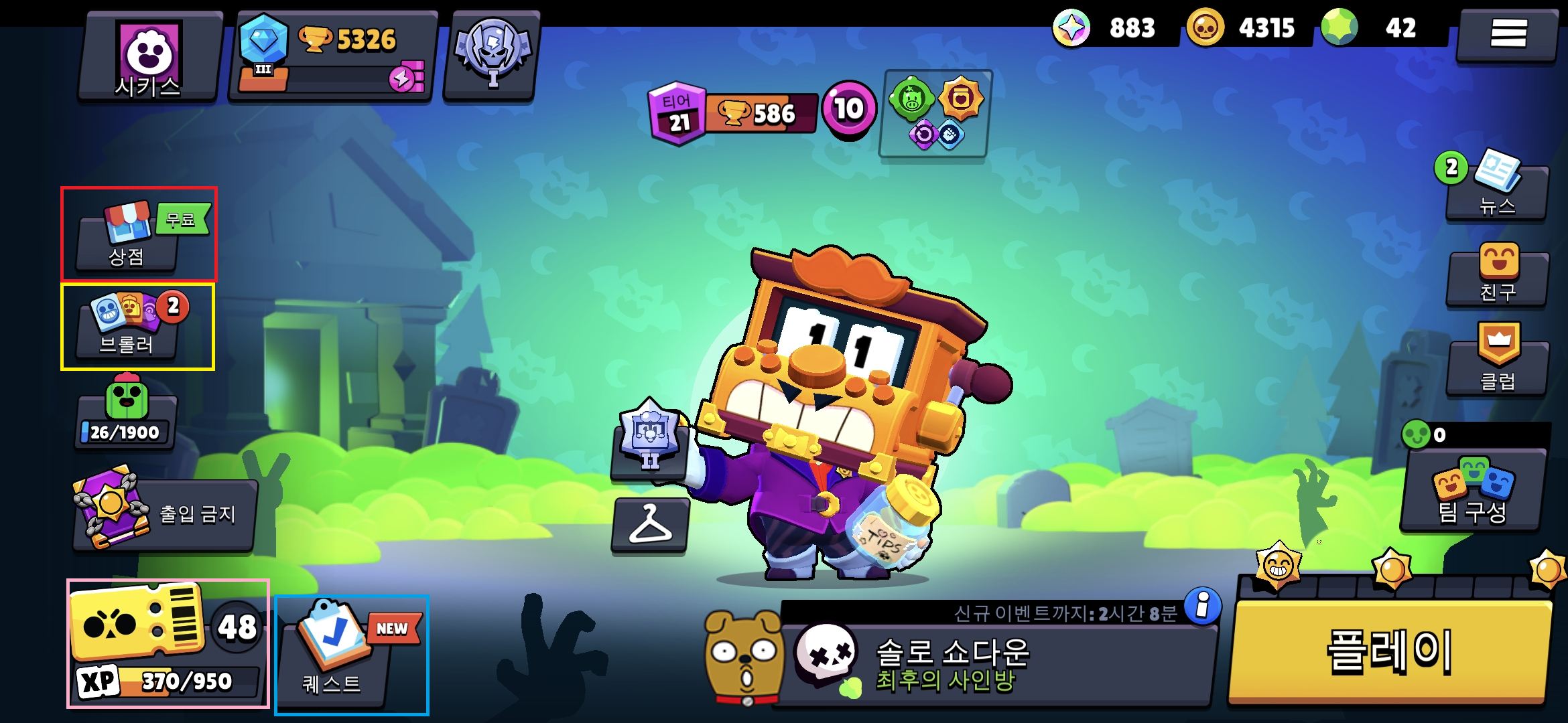 암튼 각설하고 나와같은 생각을 하는 아빠들을 위해 브롤스타즈 입문(간단한 팁)에 대해 정리를 좀 해볼까 한다. 설치와 가입은 다들 할줄 안다는 가정하에 현재 게임 진입 후, 나의 기본 화면을 보면 아래처럼 나온다.