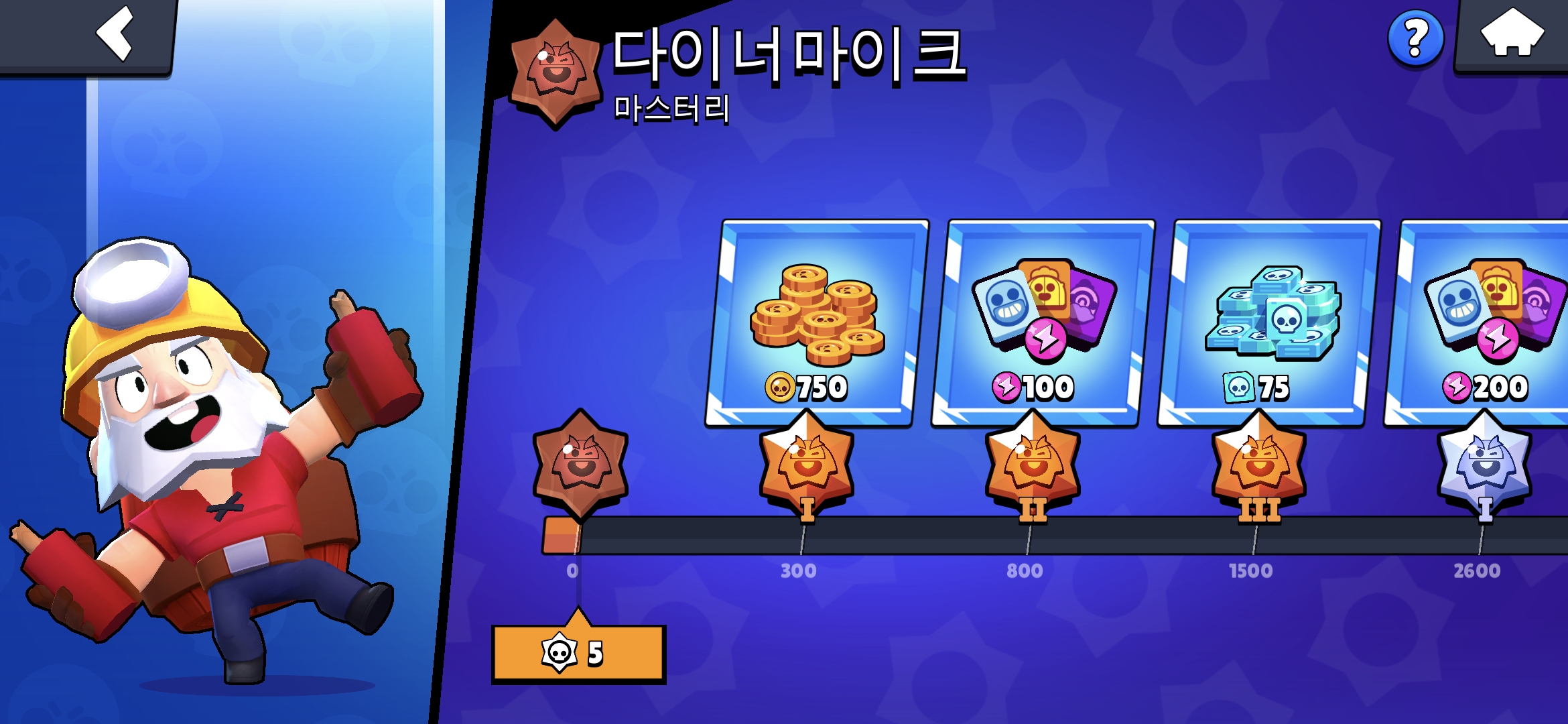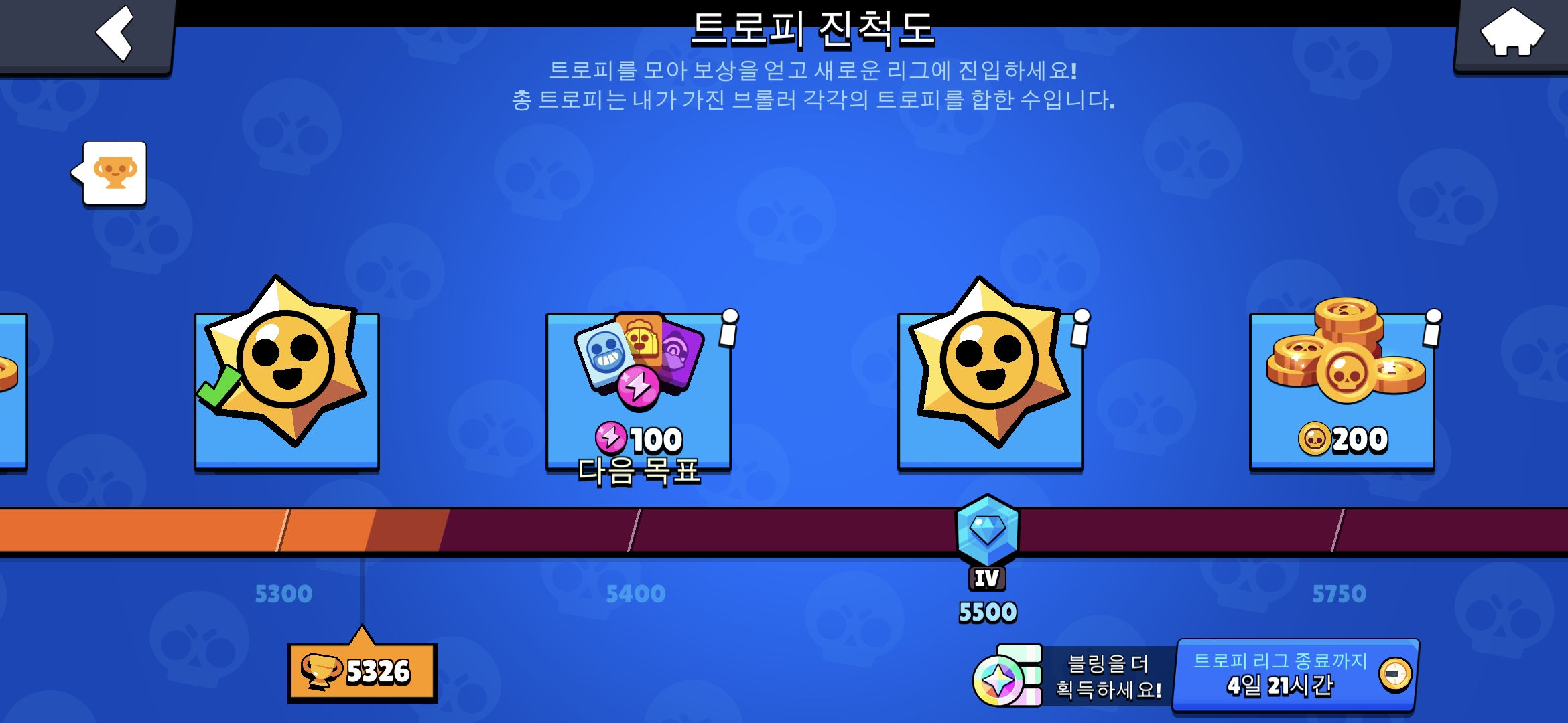 아래 그림은 트로피 진척도와 승급 과정을 보여준다. 마친가지로 승리를 할수록 게이지가 올라가는데 특정 조건에 닿으면 현금/PP/크레딧 등을 받게 된다. (참고로 크레딧은 새로운 브롤러를 열수 있는 돈이라고 보면 된다.)