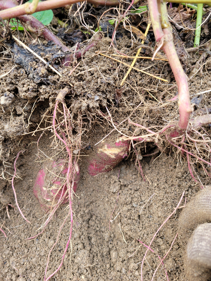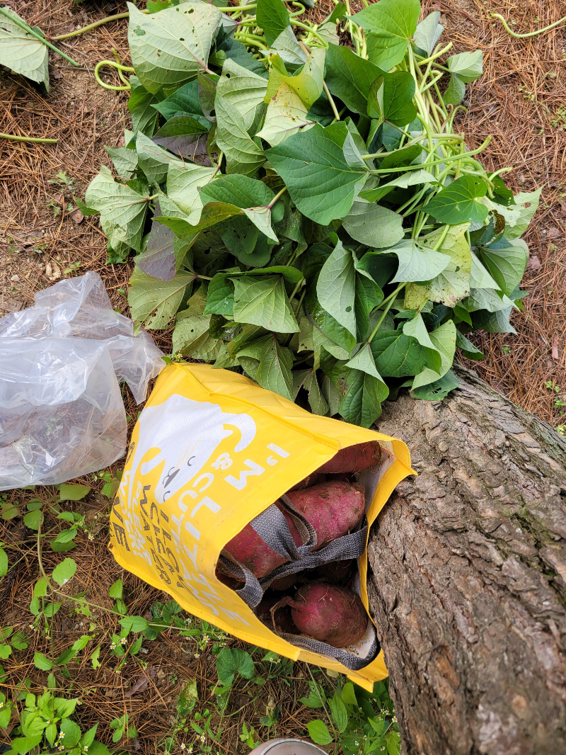 나중에 알게된건 땅속으로 뻗은 굵은 줄기를 찾고 그 주변을 파보면 제법 큰 고구마가 댕글댕글 달려있다는 것을 알게 되었다.