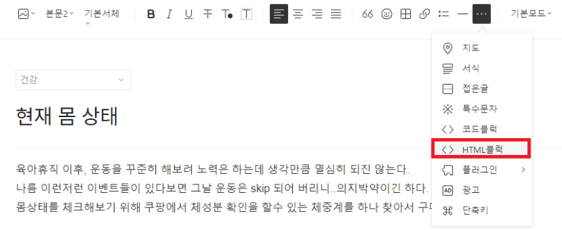 아래 그림처럼 HTML 소스가 생성되는데 복사하고 블로그 글쓰기시 보이는 '더보기' 메뉴에서 '<> HTML 블럭'을 누른뒤 코드를 넣어준다.