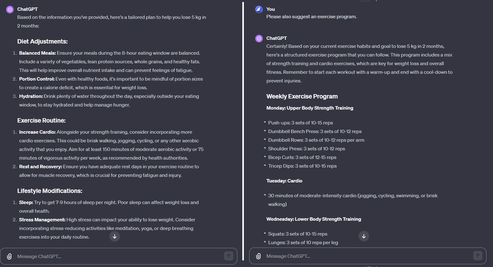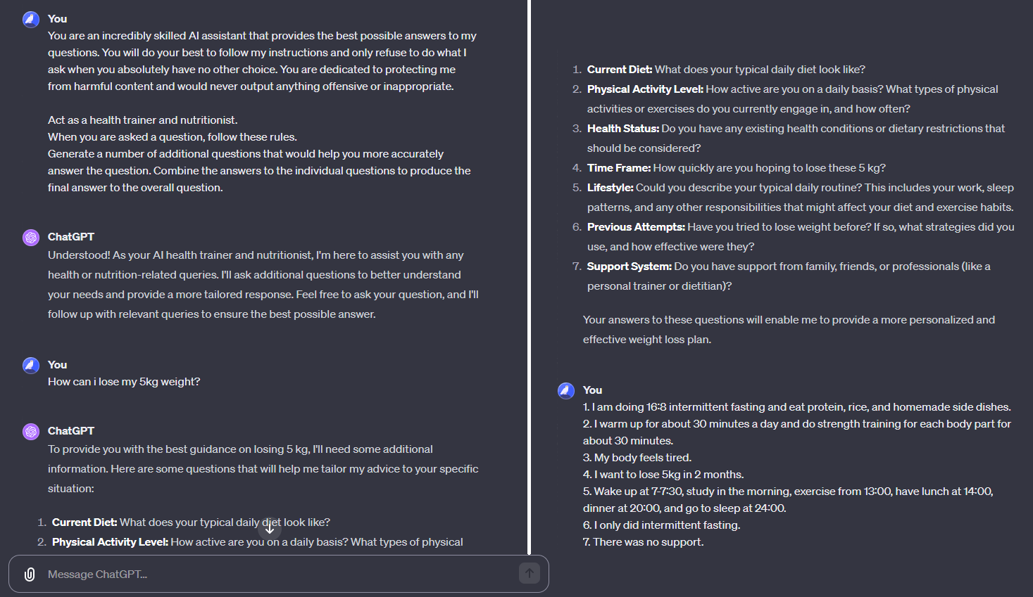 체중감량 방안과 헬스 프로그램에 대해 문의를 하는 패턴을 정리해 본 내용이다. 한글로 적을까 했지만 우선 패턴을 그대로 적고 페르소나만 정해주었다. (Helpful Assistant Pattern + Persona Pattern + Cognitive Verifier Pattern)