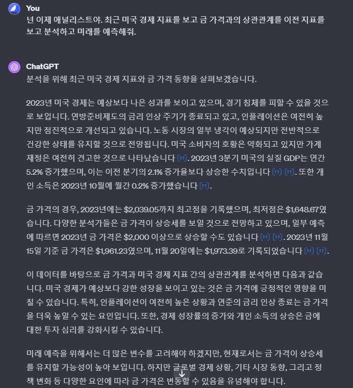 예를 들어보면 아래와 같이 질문을 던졌는데 영어로 대답을 해준다. 그리고 대답이 참 길다.. 매번 프롬프트에 넣어주는 것도 번거롭고 해서 Custom Instructions을 활용해 보기로 했다.